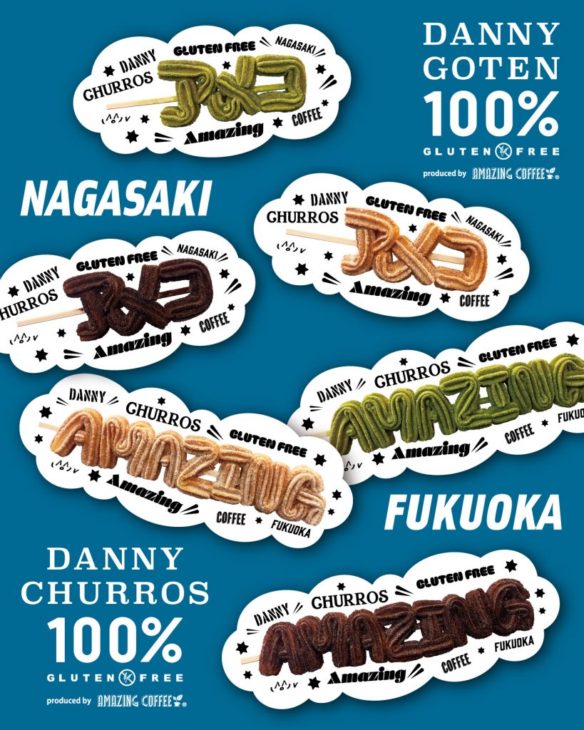 「DANNY GOTEN produced by AMAZING COFFEE(長崎店)」「DANNY CHURROS produced by AMAZING COFFEE(福岡・天神店)」にて、「アメコ」「AMAZING」の文字チュロス®デザインの限定記念ステッカーをご来店のみなさまにプレゼント!ぜひご来店ください。