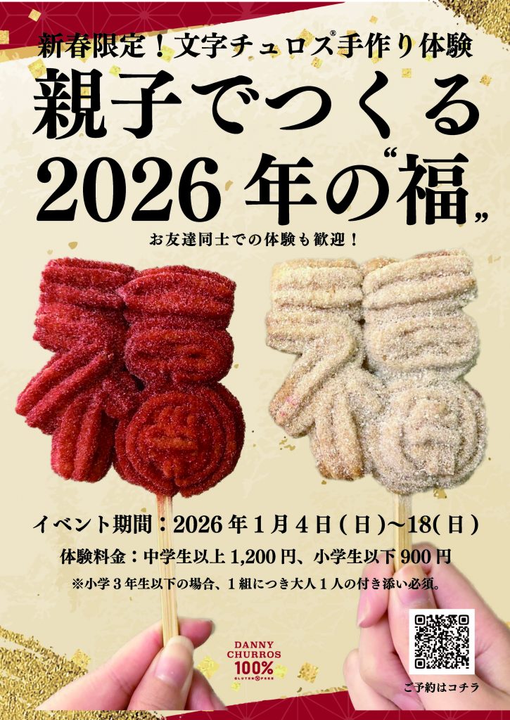 皆さん、2026年はどんな1年にしたいですか?こんなことをやりたいあんなことにチャレンジしたいなど、色々夢が膨らんでいるかと思います。そんな皆さんにももち店から、1年を通して「福」が舞い降りるように願いを込めまして文字チュロスで「福をつくる!」イベントを開催します。親子で、お友達と一緒に体験し「笑う角には福来たる」でワイワイ言いながら、福を作って福を食べて”福”を呼び込みましょう!皆様のご予約をお待ちしております。